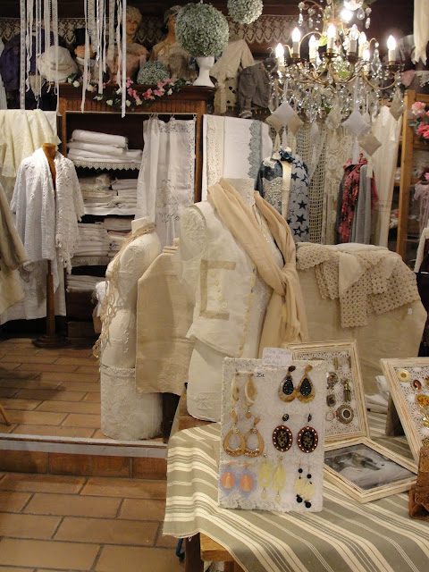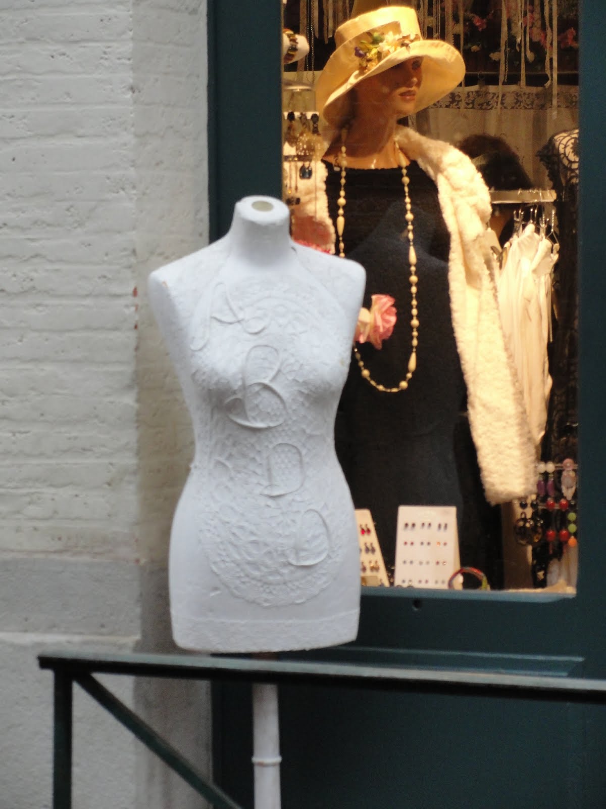She covers all her mannequins with vintage and antique lace and linen.